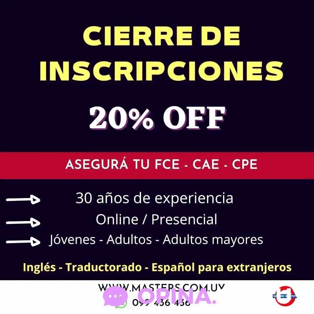 La Academia de Inglés Masters' Institute, ubicada en Montevideo, es una opción ideal para quienes buscan aprender o mejorar su inglés de manera efectiva. Con un enfoque en la personalización de la enseñanza, esta academia ofrece clases en línea y presenciales, adaptándose a las necesidades de cada estudiante.Clases en línea y servicios flexibles