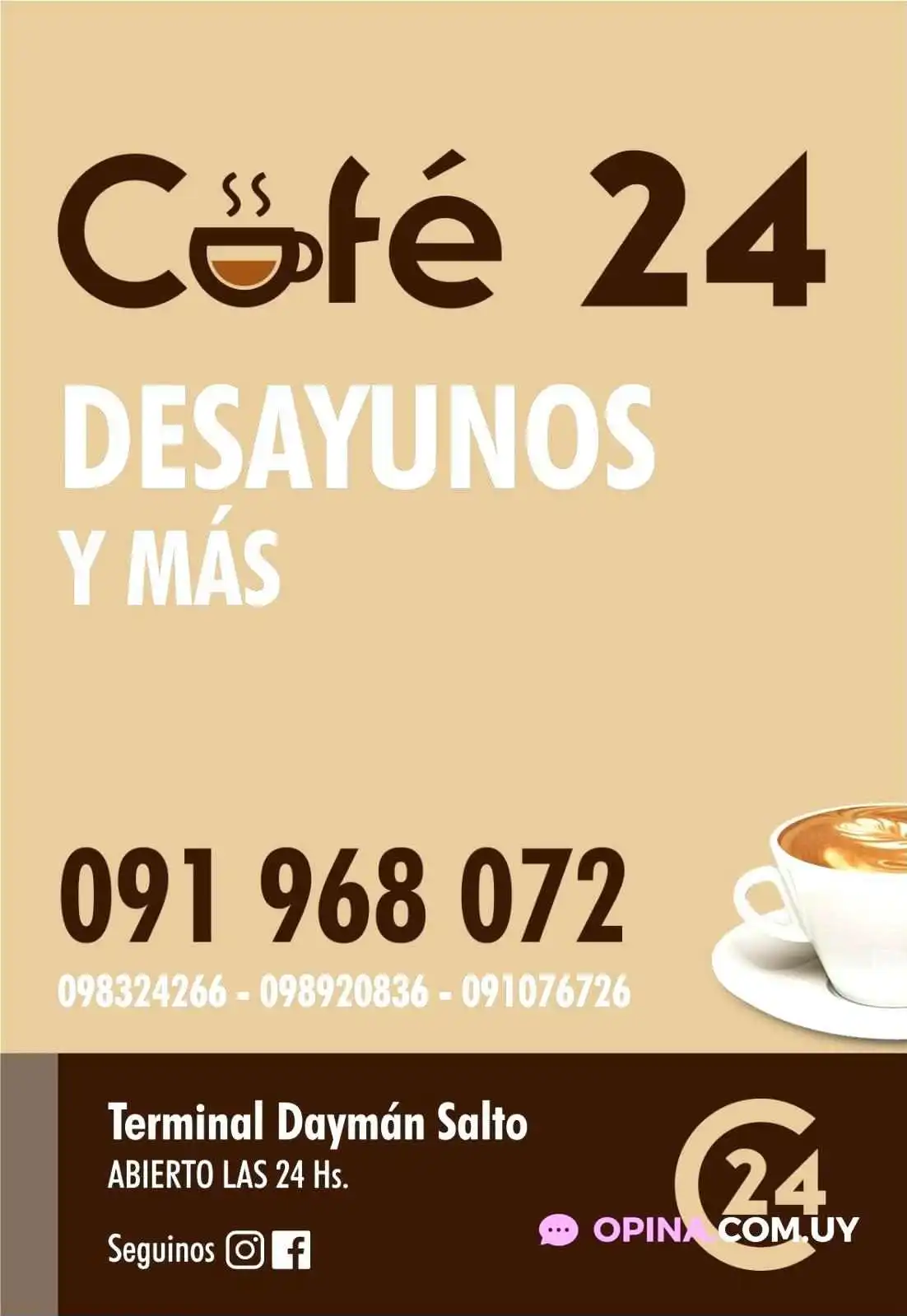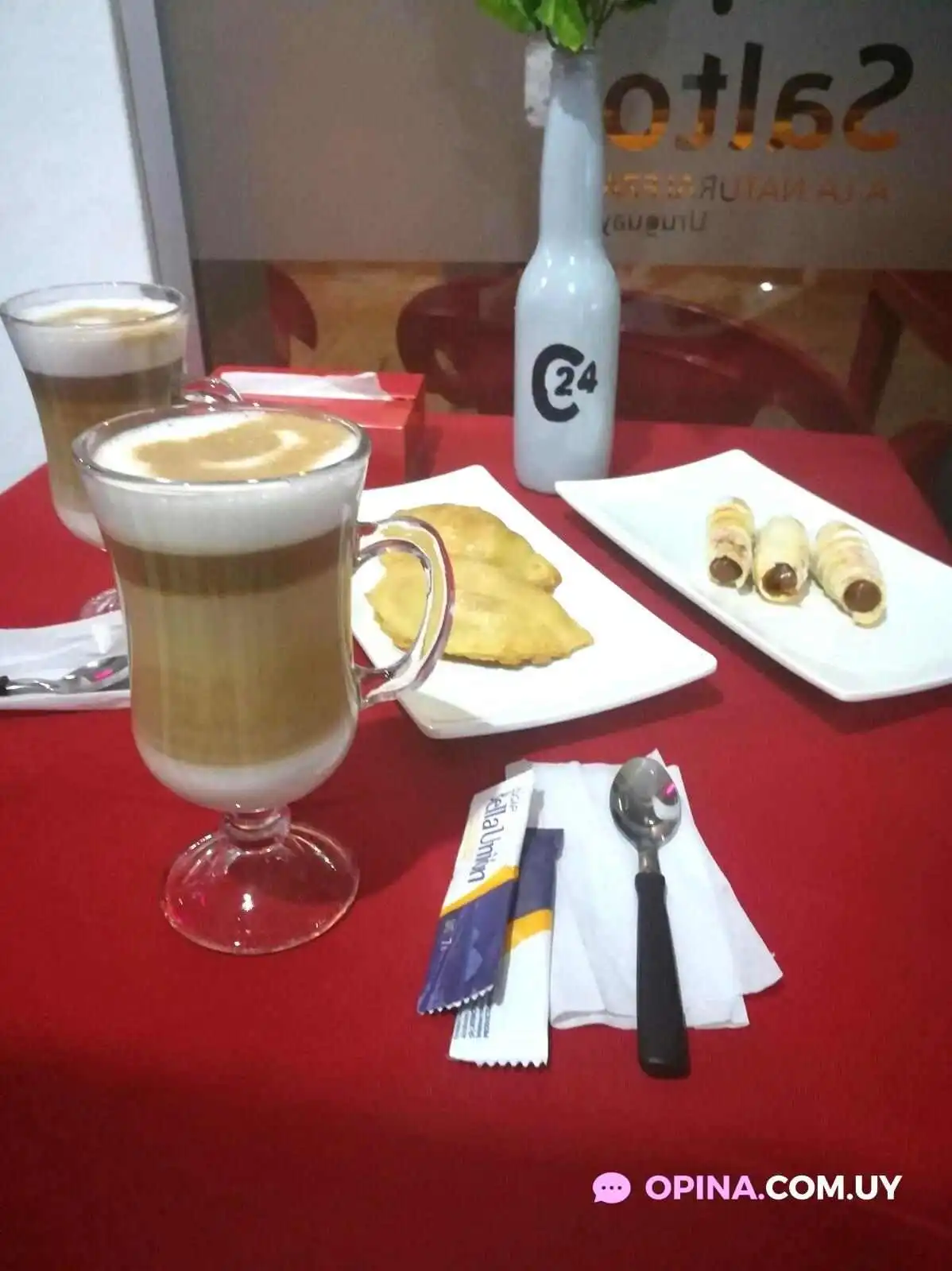 En Café 24, se puede disfrutar de una variada carta que incluye: - Cafés de especialidad: Desde un espresso intenso hasta un capuchino suave, cada taza es preparada con gran esmero. - Tortas y pastelería: Deliciosos postres que complementan perfectamente el café, ideales para compartir o disfrutar en solitario. - Opciones saladas: Sándwiches y tostadas para aquellos que buscan algo más sustancioso. - Ambiente agradable: Un espacio perfecto para relajarse después de un día en las termas, con atención amigable y un servicio excepcional. En resumen, Café 24 es el lugar ideal para disfrutar de una buena charla acompañado de un excelente café. Si estás por Termas del Daymán, no te lo podés perder.