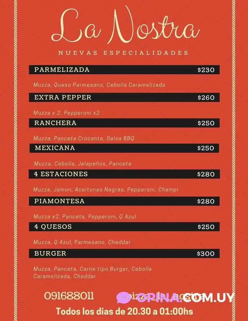 Si prefieres disfrutar de tu pizza en la comodidad de tu hogar o en algún paseo por Melo, "La Nostra" ofrece servicio para llevar. Así podrás degustar sus exquisitas creaciones donde quieras, sin perder ni un pedazo de sabor.