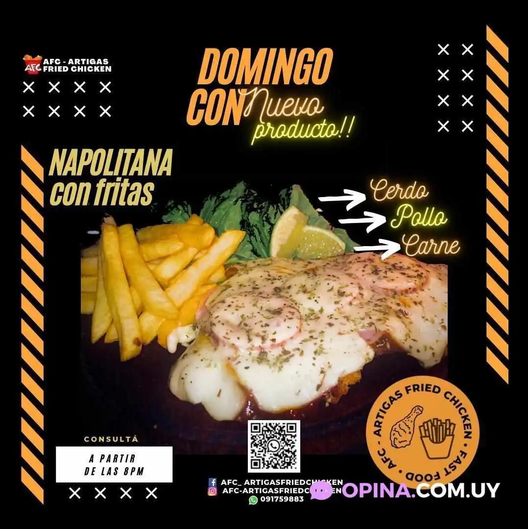 En AFC, un restaurante de comida rápida ubicado en Artigas, te ofrecemos un ambiente informal y acogedor donde los menores son siempre bienvenidos. Nuestro servicio de entrega a domicilio garantiza que puedas disfrutar de nuestros deliciosos platos en la comodidad de tu hogar.Pedidos desde el automóvil y retiros en la puerta para una experiencia conveniente
