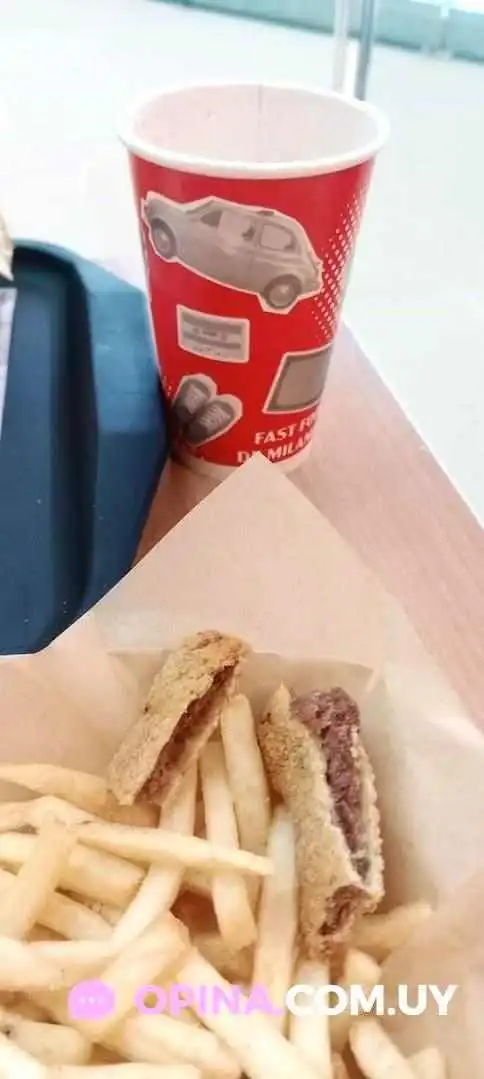 ¡Que no los engañen con las fotos, che! La posta es que tendrían que sentir vergüenza del producto que venden y al precio que lo cobran, que es caro para lo que ofrecen. Una cuadradito de milanesa de 5 x 5 Cms que no tendría más de 30 gramos de carne, que tenías que comerte de un bocado porque encima estaba durísima. En fin, no vale lo que te cobran, no solo por el tamaño sino por la mala calidad. Y las papas fritas un asco, re blanditas estaban, ¿viste?