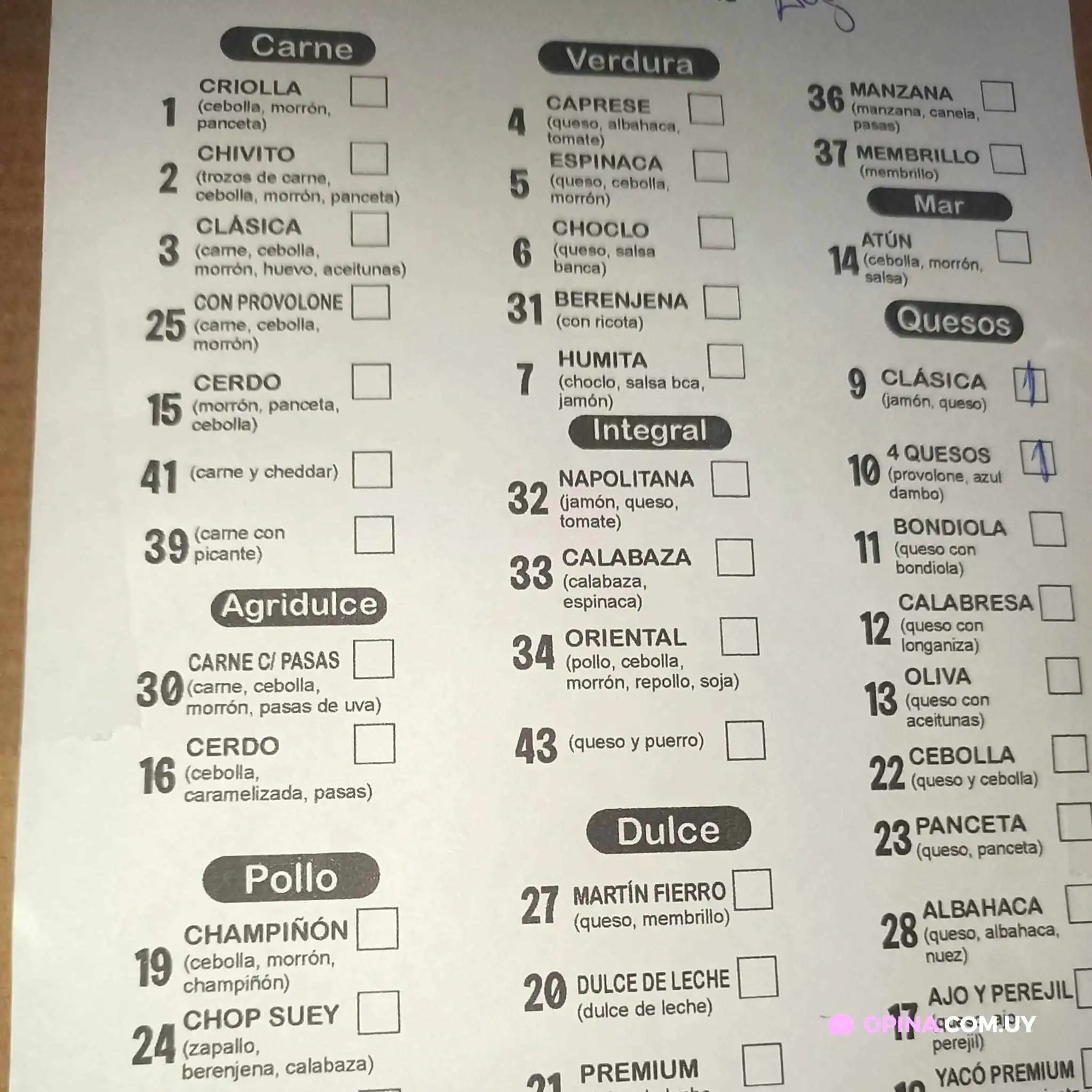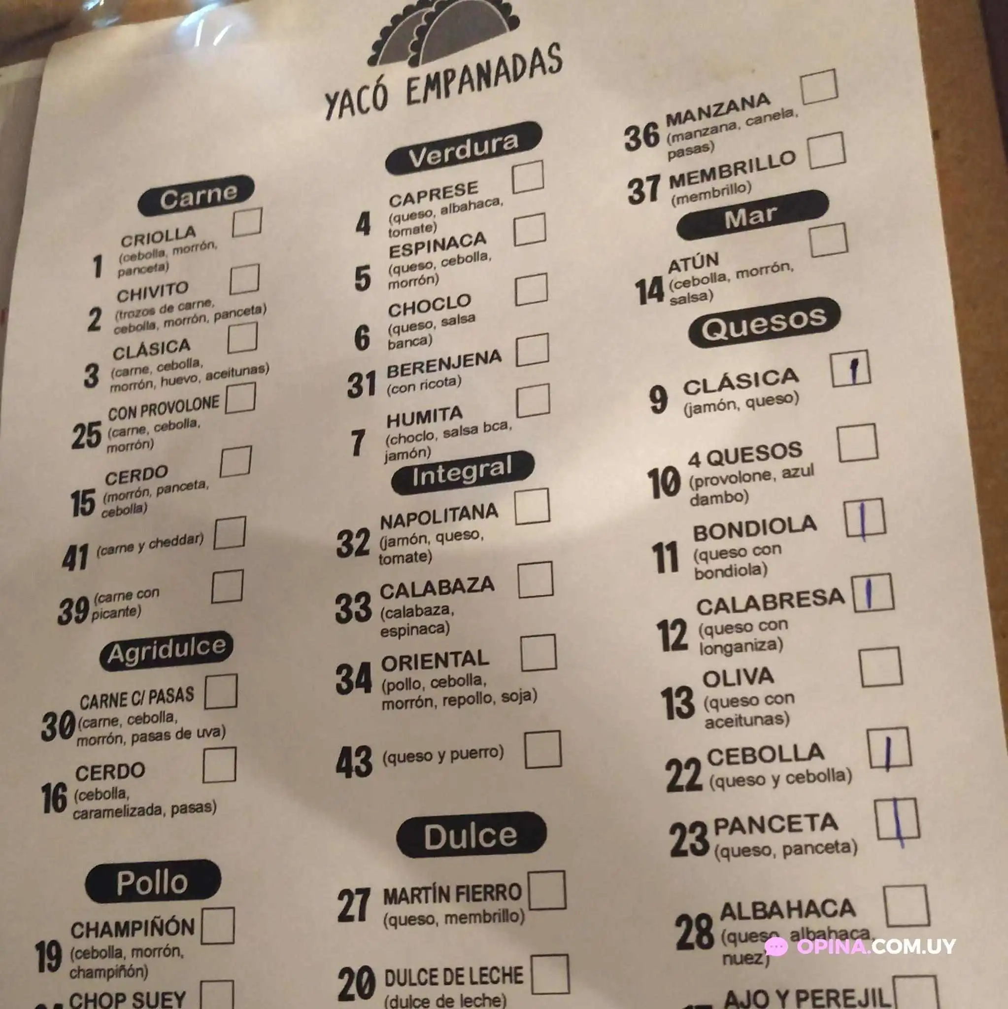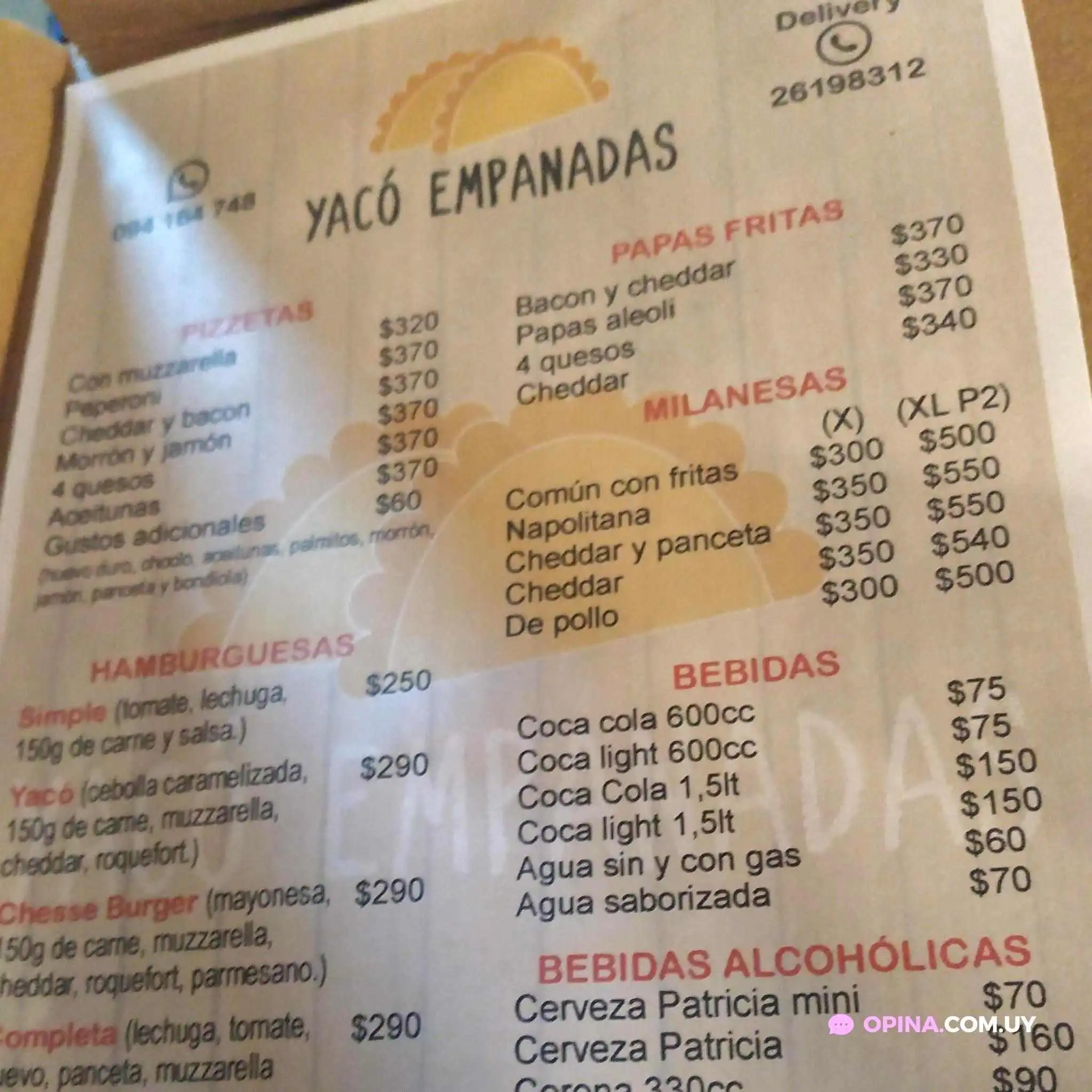 Yacó Empanadas propone diversas opciones de servicio que se adaptan a las necesidades de cada cliente. Desde retiros en la puerta hasta entrega a domicilio, siempre hay una manera conveniente de disfrutar de sus deliciosas empanadas. Para aquellos que prefieren una comida más relajada, pueden optar por comer en el local.¿Qué ofrece el menú?