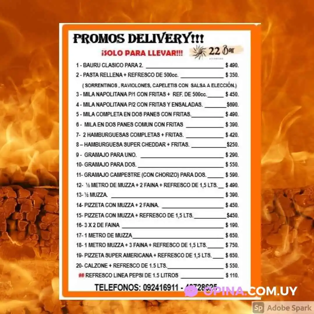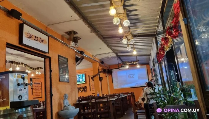 Una de las características que hacen al Restaurante 22 Bar Atlántida destacarse es su atención a los detalles en cuanto a servicios y comodidades. Cuentan con sillas altas para los más pequeños, un acceso accesible para personas en silla de ruedas y opciones de servicio como entrega a domicilio y entrega sin contacto. Además, el restaurante dispone de un espacio al aire libre con una agradable chimenea, perfecto para disfrutar de una comida al aire libre en cualquier época del año.Opciones de bebidas y entretenimiento