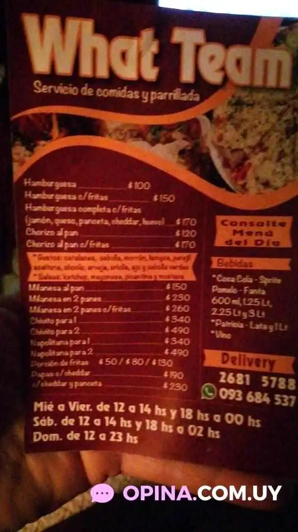 El Restaurante WHAT TEAM es conocido por sus diversas opciones de servicio. No solo podrás disfrutar de tu comida favorita en el local, sino que también cuentan con servicios de para llevar y entrega a domicilio, lo que facilita la planificación de tus comidas.