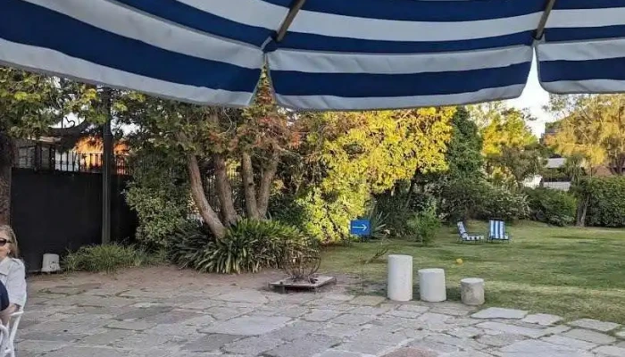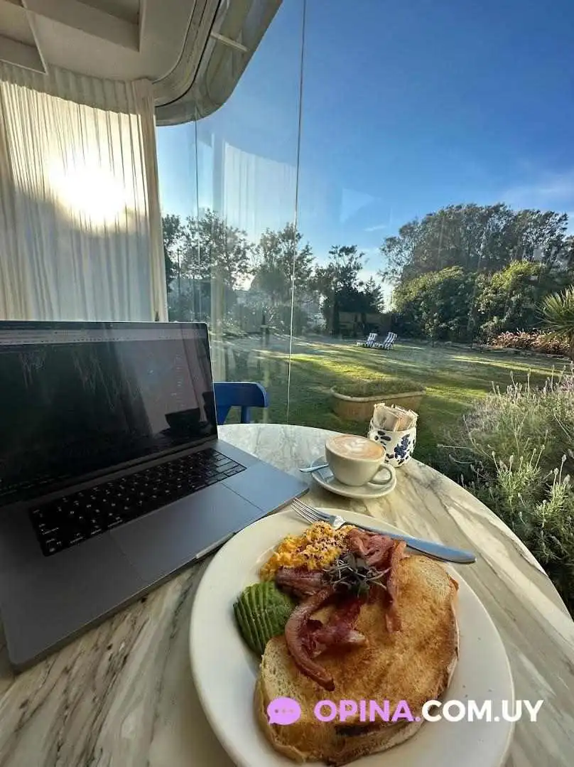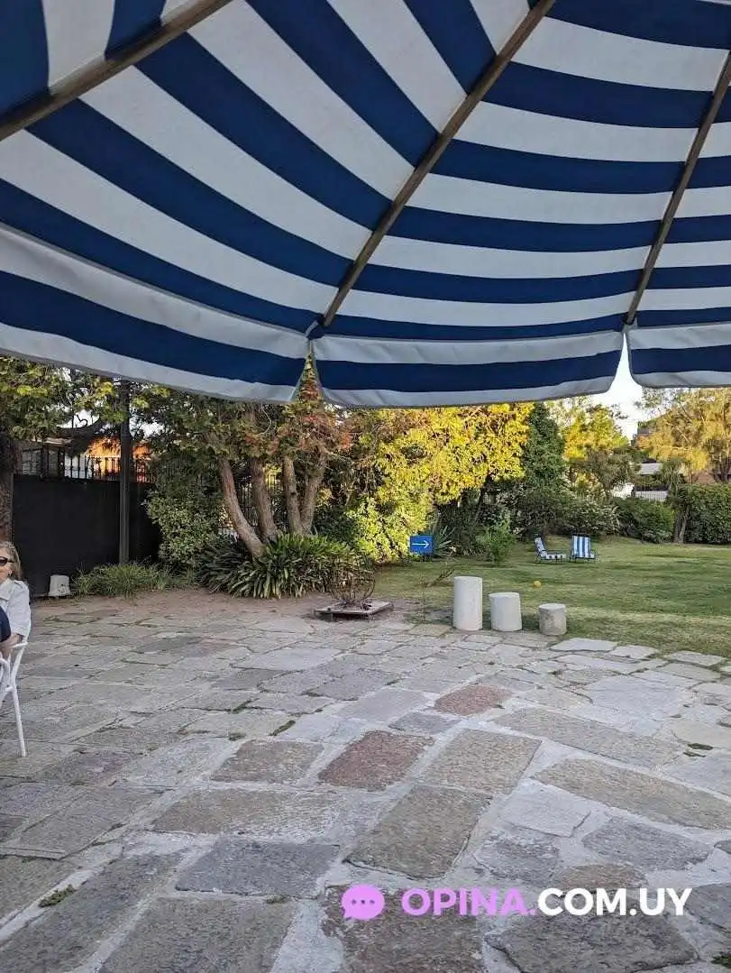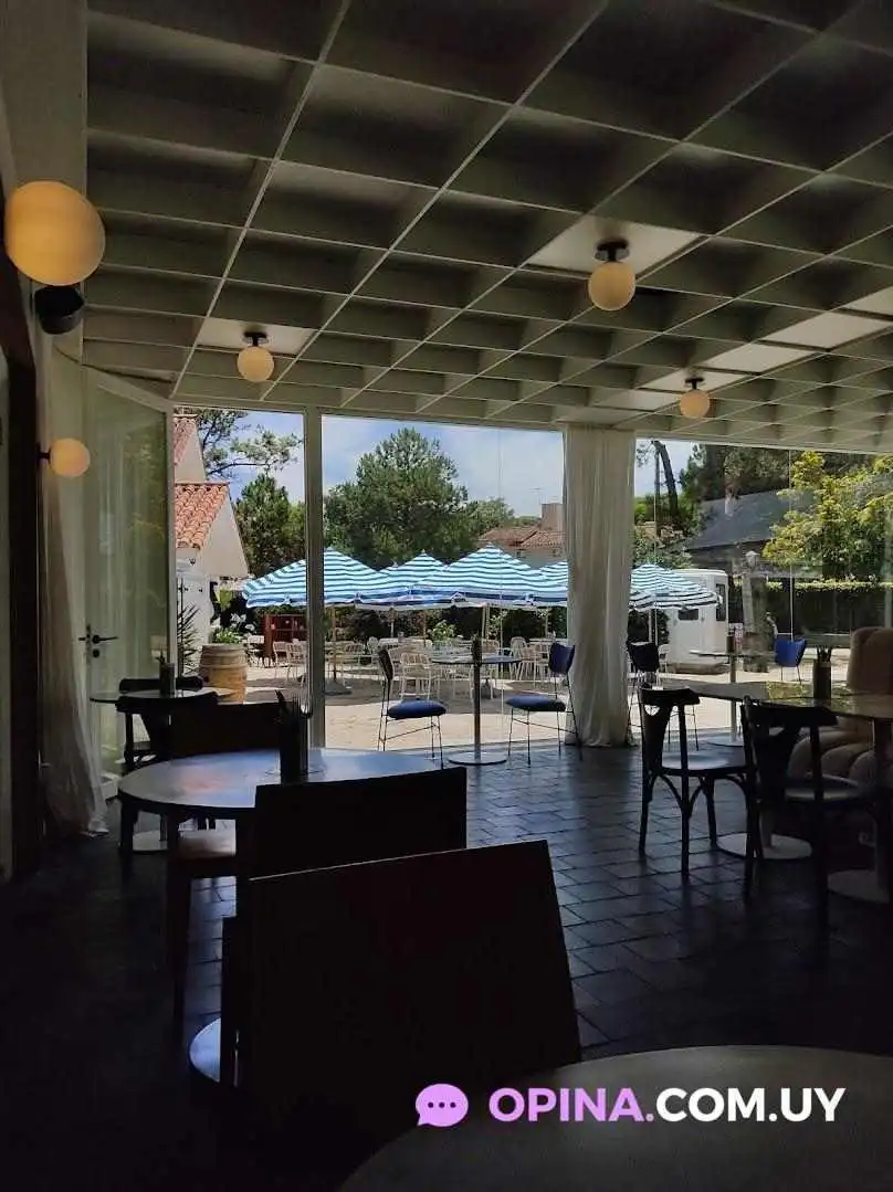 Qué hermoso lugar. Se encuentra ubicado en una encantadora casona en Carrasco, donde se arman mesas con sombrillas en su jardín delantero. Además, cuenta con mesas en el interior que están integradas al jardín, y destaca una especie de galería cubierta de vidrio con un sofá central y mesas individuales distribuidas de manera cercana entre sí.